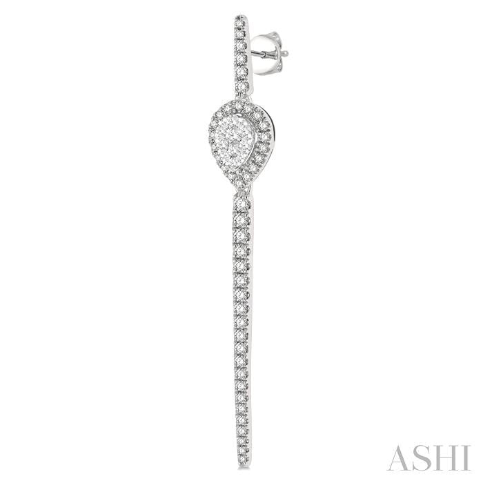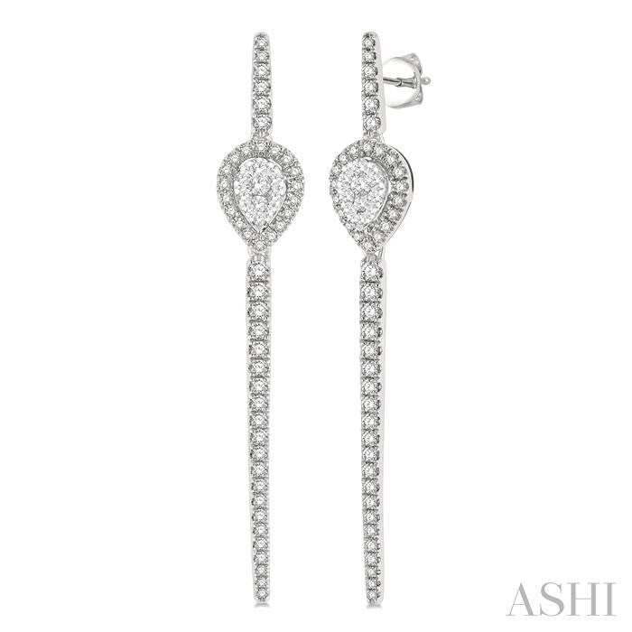 The Lovebright Collection offers a magnetism that draws anyone and everyone to its alluring assemblage. This pair of diamond long earrings comes from the mesmerizing collection. It showcases a long bar with rounded tips, and an pear shape mount at a quarter length from above along the bar. The 2-tiered pear mount features 10 each invisible set round cut diamonds on the raised middle, and 18 each micro wall set round cut diamonds haloing it from the lower tier. 27 each micro wall set round cut diamonds embellish the bar on each earring. There is a total of 110 diamonds on the earring pair, which is styled in 14 karat white gold. Total diamond weight is 1 ctw. Other metal types & colors may be available.