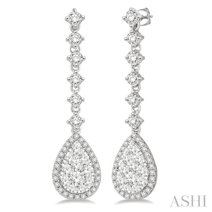 Extremely impressive, with grand embellishments and a striking layout, this pair of Lovebright earrings win your heart straight out. The dangling earrings feature 78 glittering diamonds that offer it a rich sophistication. 6 prong set round cut diamonds each form a vertical link that leads to the pear shape mount at the base. The mount is decorated with 10 invisible set round cut diamonds each. 46 pave set round diamonds adorn the rim of the pear shape mount. These beautiful earrings are styled in 14 karat white gold. Total diamond weight is 1 ctw. Other metal types & colors may be available.