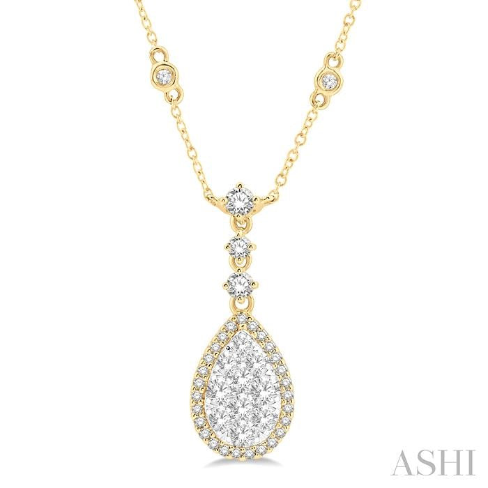 A clean and elegant finish to any piece of jewelry, just as it stands true for this Lovebright necklace. It features a single-tone pear shape necklace, with a white gold pear shape center and border. 11 invisible set round cut diamonds embellish the white gold center, while 20 micro walls set round cut diamonds to form a halo effect around it. A bezel set round cut diamond each is placed at intervals along the chain, 2 each on either side of the pear mount, a total of 4 diamonds. The Lovebright necklace is styled in 14-karat white gold. The total diamond weight is 3/4 ctw. Other metal types & colors may be available.