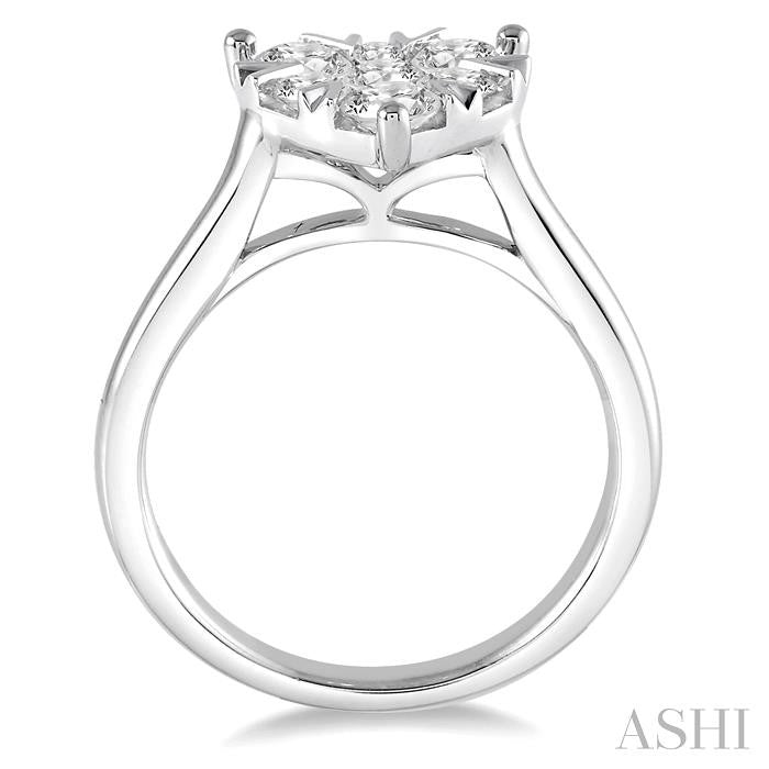 This Lovebright engagement ring is decorated with exquisite craft. The Lovebright ring is made with a invisible setting holding 7 diamonds securely forming a heart in the center. The attractive engagement ring looks pleasing to the eye, set on 14 karat white gold. Total diamonds weight is 3/4 Ctw. Other metal types & colors may be available.