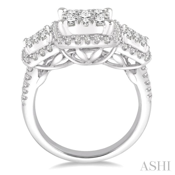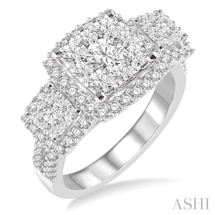 Capture all your special love moments in this timeless diamond lovebright ring. Styled in luminous 14 karat white gold this square shape ring features 3 invisible set arrangements of 27 sparkling round cut diamonds. Brilliant 62 scintillating pave set round cut diamonds beautifully encompasses the center arrangements and embellishes the shank in dazzling rows. Total diamond weight is 1 3/8 ctw. Other metal types & colors may be available.