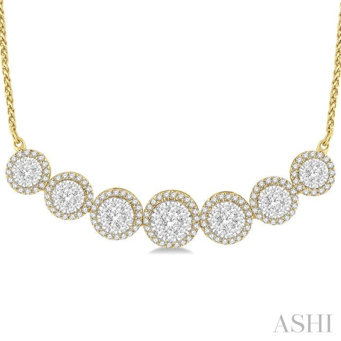 A gorgeous diamond necklace, this draws your attention like every piece of accessory in the Lovebright collection. It features a 7 round mount centerpiece, with a large round mount in the center and three each round mounts flanking it on either side. These mounts also get slightly smaller than their preceding mounts. 63 invisible set round cut diamonds embellish the 14 karat white gold center of these 7 mounts, while 130 micro wall set round cut diamonds form a border around these, on the mounts. A 1.1MM 16-inch wheat chain completes the necklace, which is styled in 14 karat yellow and white gold. Total diamond weight is 1 1/5 ctw. Other metal types & colors may be available.