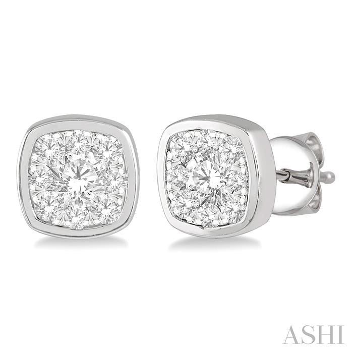 Elegant studs, these Lovebright diamond earrings are a must have pair in your jewelry case. The earrings feature a cushion shape mount that is beautifully embellished with 9 invisible set round cut diamonds each, a total of 18 diamonds on both earrings. A diamond sits in the center, while 8 diamonds encircle it. These are nestled within the mount, such that a white gold border highlights their layout. The earring is styled in 14 karat yellow and white gold and comes with push back earnut closure. Total diamond weight is 1/2 ctw. Other metal types & colors may be available.