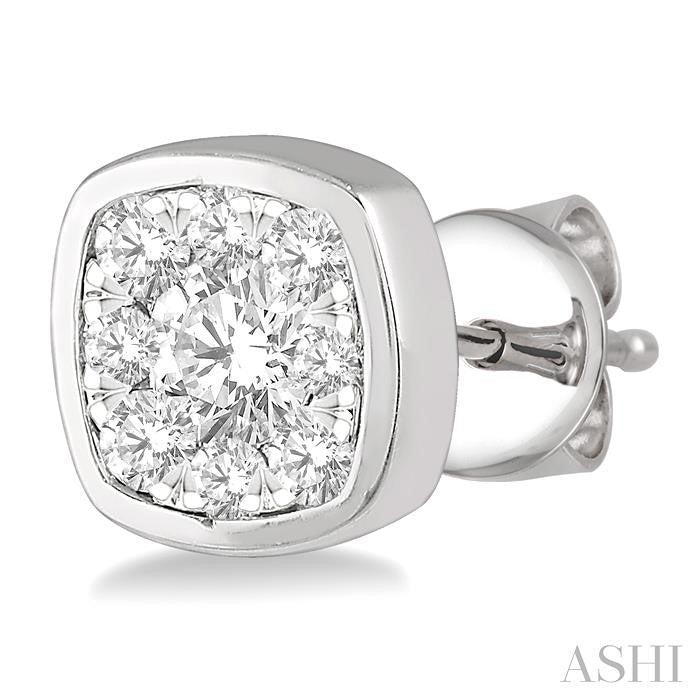 Elegant studs, these Lovebright diamond earrings are a must have pair in your jewelry case. The earrings feature a cushion shape mount that is beautifully embellished with 9 invisible set round cut diamonds each, a total of 18 diamonds on both earrings. A diamond sits in the center, while 8 diamonds encircle it. These are nestled within the mount, such that a white gold border highlights their layout. The earring is styled in 14 karat white gold and comes with push back earnut closure. Total diamond weight is 1/3 ctw. Other metal types & colors may be available.