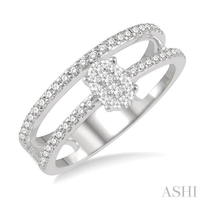 A lovely Lovebright diamond fashion ring, this lends style to your looks. It features a split twin band structure, with an oval shape center mount on one of the rings. Embellishing the oval mount are 10 invisible set round cut diamonds. Also decorating the twin bands is more diamonds. There are 20 micro wall set round cut diamonds on the ring with the mount, 10 each flanking it on either side. On the other band are seen 22 micro wall set round cut diamonds, lined in a row. The Lovebright fashion ring is styled in a polished rhodium finish 14 karat white gold. Total diamond weight is 1/3 ctw. Other metal types & colors may be available.