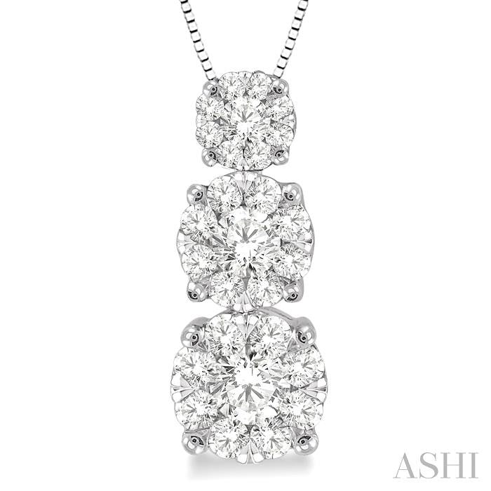 Show her your love with this elegant diamond lovebright pendant. Rendered perfectly in 14 karat white gold, this pendant showcases three round frames embellished with array of dazzling round cut accented diamonds. Brilliant 27 round cut diamonds are finely set in invisible settings. This pendant hangs with a fashionable box chain. Total diamond weight is 1/2 ctw. Other metal types & colors may be available.