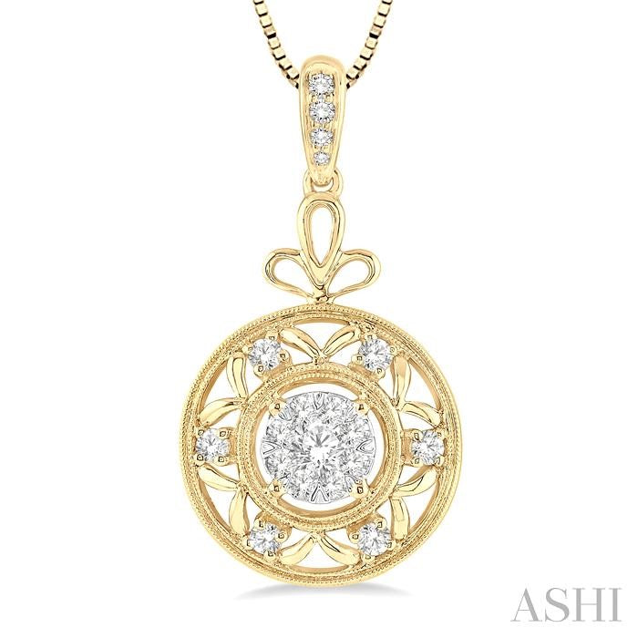 Dazzle up her neckline with this charming diamond Lovebright pendant. Crafted in glinting 14 karat yellow and white gold this double circle frame pendant is graced with a set of sparkling round cut diamonds nestled amid open circle design and the outer halo frame is embellished with shimmering round cut diamonds accents along with the front edge. Brilliant 19 diamonds are set in invisible, prong settings. This pendant hangs up from a fashionable box chain. Total diamond weight is 1/2 ctw. Other metal types & colors may be available.
