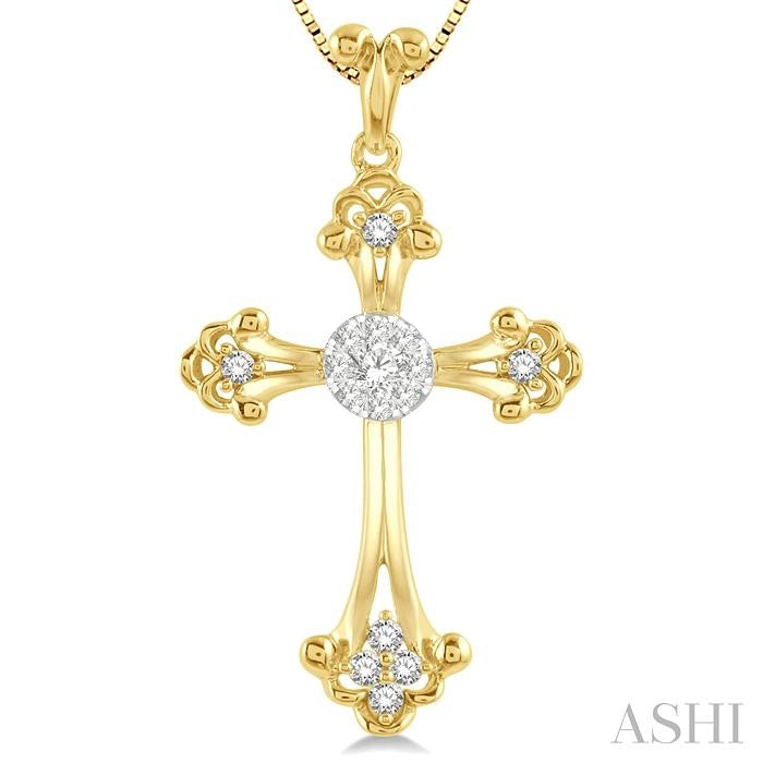 A majestic art deco style Lovebright diamond pendant, this makes a classy option for a cross charm pendant. It features an intricate lattice and shaping of the cross, which is further enhanced by diamond embellishments that give the pendant a stunning look. A circular mount sits in the center and is adorned by a 1/20 ct invisible set round cut diamond in the center, haloed by 8 smaller round cut diamonds. 7 prong set round cut diamonds to decorate the arms, one each on the top three arms and 4 on the bottom arm. An 18-inch 14-karat yellow gold box chain holds the pendant, which is styled in 14-karat yellow and white gold. The total diamond weight is 1/4 ctw. Other metal types & colors may be available.