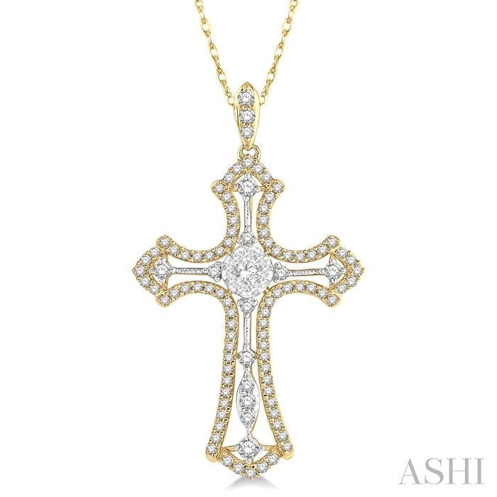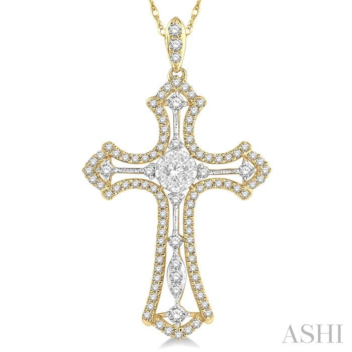 An exquisite period Lovebright diamond cross pendant, this gives you the vintage appeal of the Victorian era. Its beauty lies in its attractive craftsmanship and well-thought layout. The cross frame and the accentuations within it, are highlighted by glittering round cut diamonds. In the center of the cross, sits a white gold round mount with a 1/10 ctw prong set round cut diamond in the middle, encircled by 9 round cut diamonds. 8 round cut diamonds accent the bar extensions, one each on either end, while 1 diamond can be seen at the tip. 3 round cut diamonds each, adorn the marquise mount inside the cross and the pendant loop at the top. 84 pave set round cut diamonds to encrust the cross frame. A yellow gold 18-inch cat chain carries the pendant, which is styled in 14-karat yellow and white gold. The total diamond weight is 3/4 ctw. Other metal types & colors may be available.