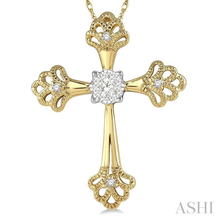 A unique cross charm pendant, this catches the eye instantly. It features tree-shaped arms that give it a spectacular look. Also adorned are round-cut diamonds that add to the charm of the pendant. A white gold round mount sits in the center and is decorated with 9 pressure set round cut diamonds, one in the center and 8 forming a halo around it. Apart from this, there are 4 prong sets of round cut diamonds, one each on the arms, in the center of the tree-like structures, which also feature a milgrain finish, 14 karat yellow gold Rope chain completes the pendant. The pendant is styled in 14 karat yellow and white gold. Total diamond weight is 1/8 ctw. Other metal types & colors may be available.