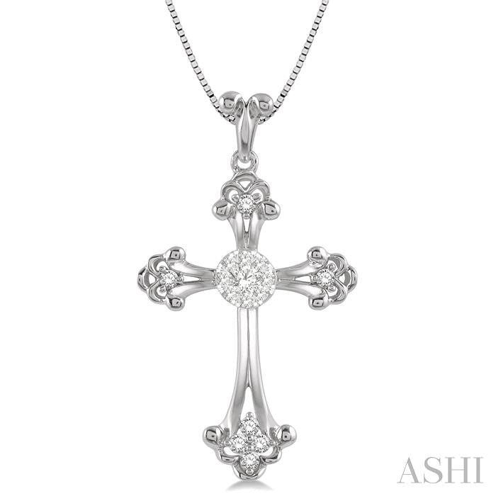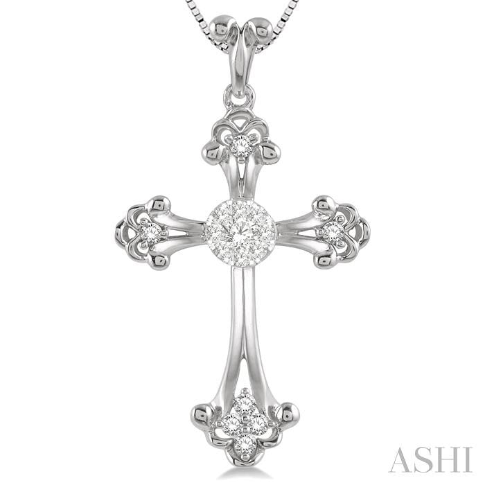 A majestic art deco style Lovebright diamond pendant, this makes a classy option for a cross charm pendant. It features an intricate lattice and shaping of the cross, which is further enhanced by diamond embellishments that give the pendant a stunning look. A circular mount sits in the center and is adorned by a 1/20 ct invisible set round cut diamond in the center, haloed by 8 smaller round cut diamonds. 7 prong set round cut diamonds to decorate the arms, one each on the top three arms and 4 on the bottom arm. An 18-inch 14-karat white gold box chain holds the pendant, which is styled in 14-karat white gold. The total diamond weight is 1/4 ctw. Other metal types & colors may be available.