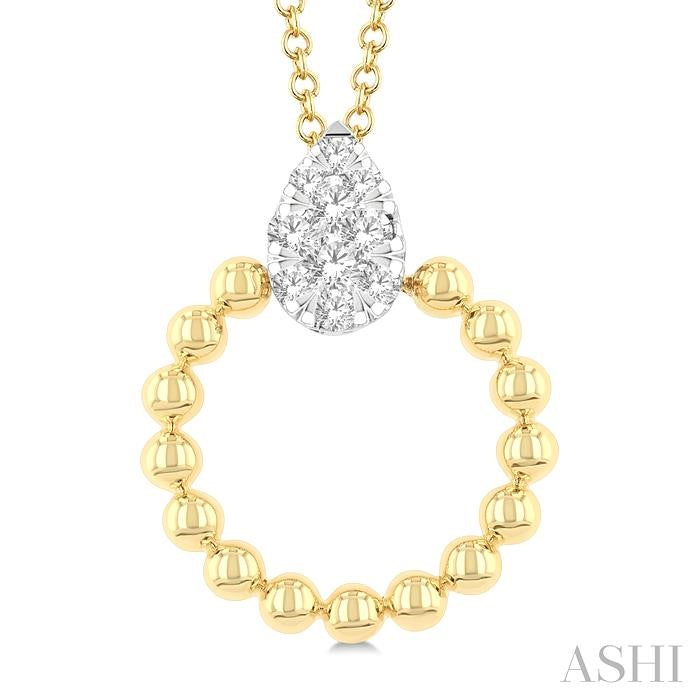 Radiating grace with a touch of contemporary flair, this Lovebright diamond fashion pendant captures timeless beauty in a fresh silhouette. It showcases a pear-shaped white gold mount at the top, glittering with 10 pressure-set round cut diamonds that form a dazzling cluster. Wrapping around the lower edge of the mount is a semicircle of smooth yellow gold ball beads, adding warmth and dimension to the design. An Cable Chain 0.85 MM in 18 Inches with Spring Lock & Extenders at 16' & 17' carries the Lovebright diamond fashion pendant, both crafted in rhodium finish 10 karat yellow and white gold. Total diamond weight is 1/6 Ctw. Other metal types & colors may be available.