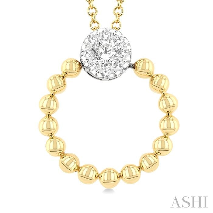 Radiating brilliance with a modern twist, this Lovebright diamond fashion pendant brings refined charm to everyday elegance. It features a circular white gold mount at the top, adorned with 9 pressure-set round cut diamonds that create a luminous cluster. Wrapping from end to end around the lower edge is a graceful arc of polished yellow gold ball beads, adding warmth and contrast to the design. An Cable Chain 0.85 MM in 18 Inches with Spring Lock & Extenders at 16' & 17' carries the Lovebright diamond fashion pendant, both styled in rhodium finish 10 karat yellow and white gold. Total diamond weight is 1/6 Ctw. Other metal types & colors may be available.