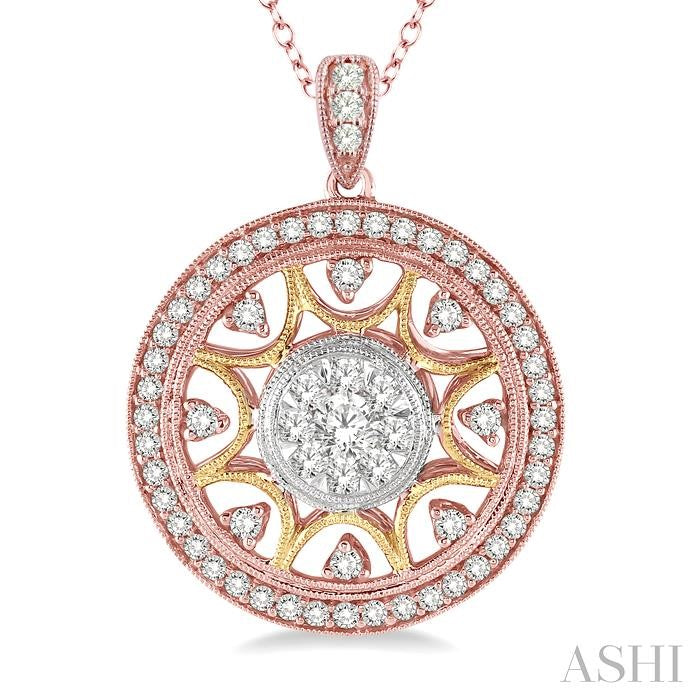 Make a dramatic statement with this gorgeous tri color gold diamond lovebright pendant. Crafted in glinting 14 karat white, yellow and pink gold this open work circle frame pendant is graced with a set of sparkling round cut diamonds nestled amid open circle design and the outer halo frame is embellished with shimmering round cut diamonds accents. Brilliant 68 diamonds are set in invisible and prong settings. This pendant suspend from a Cable Chain. Total diamond weight is 1 Ctw. Other metal types & colors may be available.