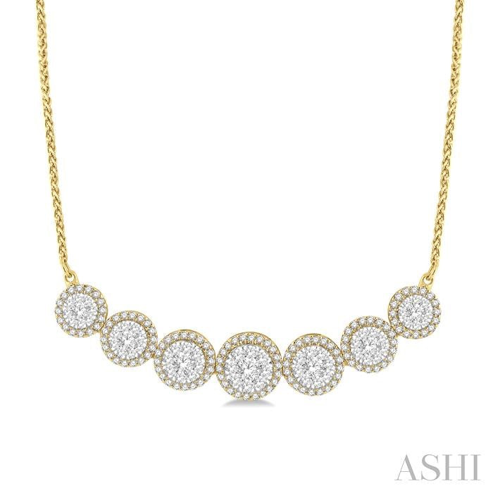 A gorgeous diamond necklace, this draws your attention like every piece of accessory in the Lovebright collection. It features a 7 round mount centerpiece, with a large round mount in the center and three each round mounts flanking it on either side. These mounts also get slightly smaller than their preceding mounts. 63 invisible set round cut diamonds embellish the 14 karat white gold center of these 7 mounts, while 130 micro wall set round cut diamonds form a border around these, on the mounts. A 1.1MM 16-inch wheat chain completes the necklace, which is styled in 14 karat yellow and white gold. Total diamond weight is 1 1/5 ctw. Other metal types & colors may be available.