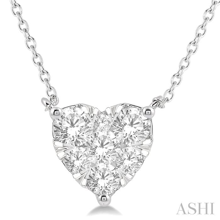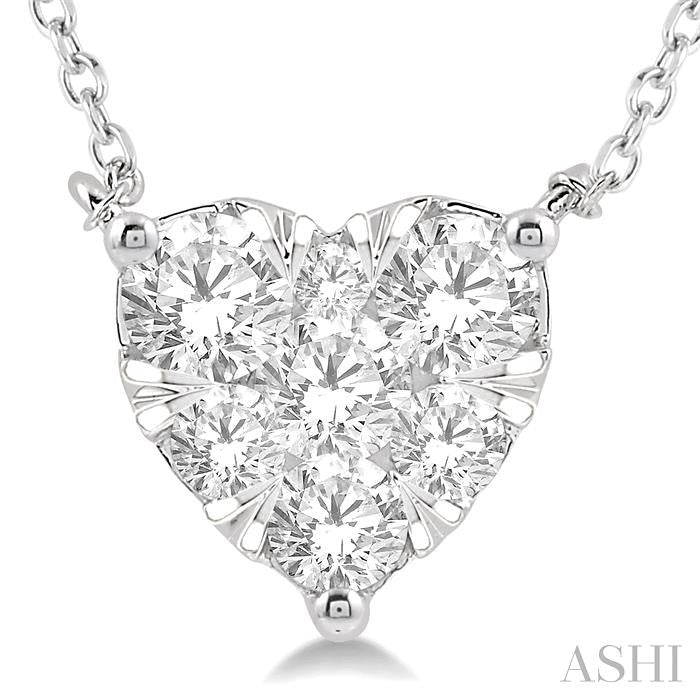 Luxury with delicacy has taken the shape of this 'Lovebright' heart necklace This pleasing necklace of high excellence exhibits 7 invisibly set round diamonds in enduring 14 Karat White Gold. With a cat chain and a lobster lock for secure wearing, this necklace is a wonderful gift to celebrate any event. Total diamond weight is 3/4 ctw. Other metal types & colors may be available.
