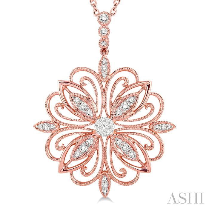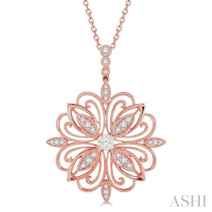 The Lovebright collection boasts of great craftsmanship and aesthetic beauty, and this pendant is a proof of it. It features an intricately carved marquise and heart shape lattice that also offers a floral touch to it. Also, round cut diamonds add a majestic finish to it. 9 invisible set round cut diamonds sit pretty on a white gold round center mount, while 27 prong and bezel set round cut diamonds embellish the small marquise mounts and the tiny circular mounts that make up the suspension loop for the pendant. Milgrain highlights the design. A 14 karat rose gold 18-inch BOX10 box chain holds the pendant, which is styled in 14 karat rose and white gold. Total diamond weight is 1/3 ctw. Other metal types & colors may be available.