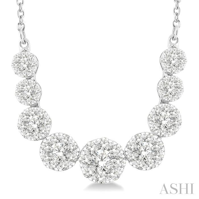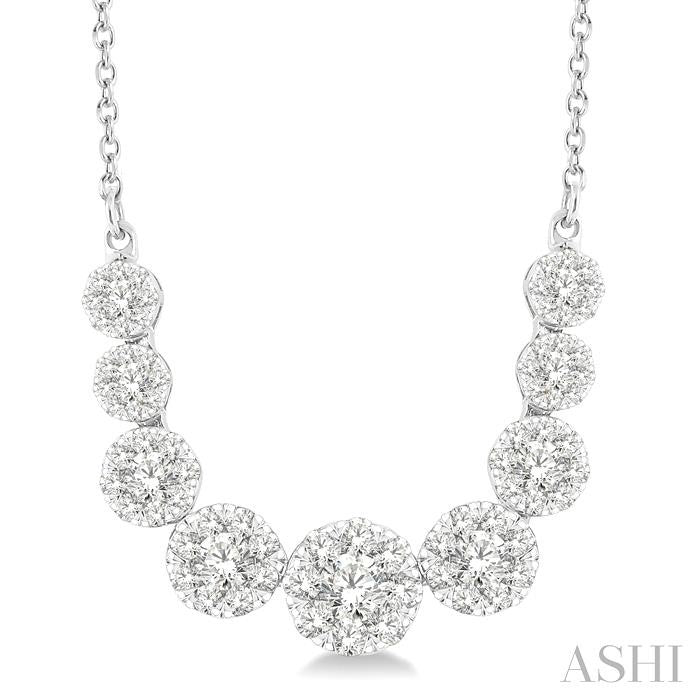 This scintillating, fresh and timeless diamond Lovebright necklace will complement your sweetheart's look and style. Fashioned on luminous 14 karat white gold with a cat chain and a lobster lock, this lavish necklace showcases shimmering 81 round cut diamonds that are set in a beautifully complementary array motif. Diamonds are perfectly invisible set. Total diamond weight is 1 Ctw. Fastens with a secure clasp. Other metal types & colors may be available.