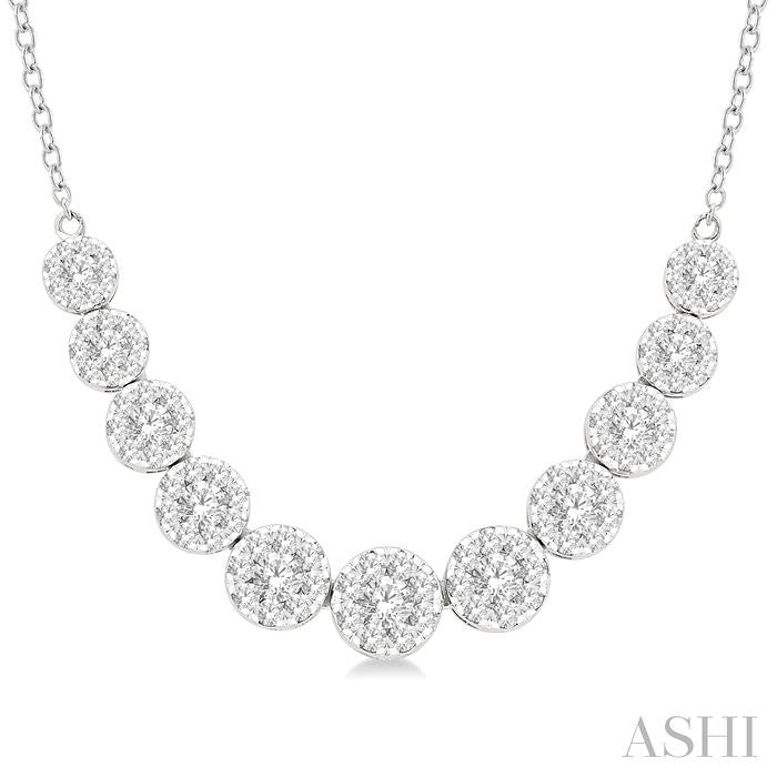 This scintillating, fresh and timeless diamond Lovebright necklace will complement your sweetheart's look and style. Fashioned on luminous 14 karat white gold with a cat chain and a lobster lock, this lavish necklace showcases shimmering 99 round cut diamonds that are set in a beautifully complementary array motif. Diamonds are perfectly invisible set. Total diamond weight is 1 1/2 Ctw. Fastens with a secure clasp. Other metal types & colors may be available.