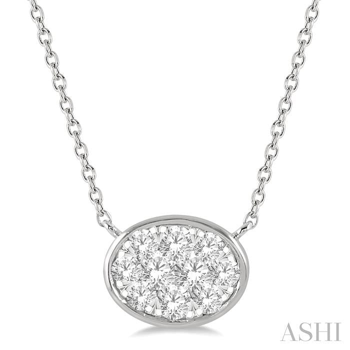 A glittering oval shape Lovebright diamond marks the beauty of this striking necklace. The necklace is closely encrusted with round cut diamonds that offer it the glimmer, making it an instant eye-catcher. It features 10 invisible set round cut diamonds in the center mount, lending the necklace visual appeal. An 18-inch cat chain with lobster lock closure carries the Lovebright necklace, The necklace is framed in 14-karat white gold. The total diamond weight is 1/3 ctw. Other metal types & colors may be available.