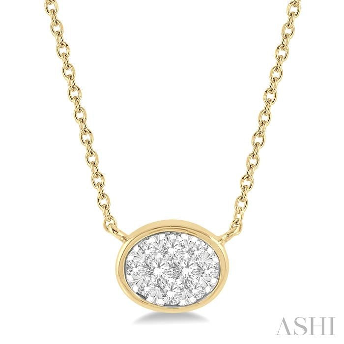 A glittering oval shape Lovebright diamond marks the beauty of this striking necklace. The necklace is closely encrusted with round cut diamonds that offer it the glimmer, making it an instant eye-catcher. It features 10 invisible sets of round cut diamonds in the center mount, lending the necklace visual appeal. An 18-inch cat chain with lobster lock closure carries the Lovebright necklace, The necklace is framed in 14-karat yellow and white gold. The total diamond weight is 1/6 ctw. Other metal types & colors may be available.