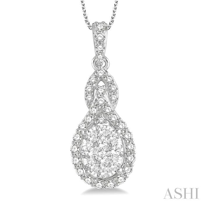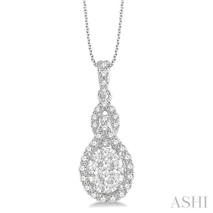 An elegant Lovebright pendant, this offers a gorgeous look to the neckline. It is closely covered with round-cut diamonds, giving it a full and heavy look. The pendant features a raised oval shape mount that is bordered by a frame of the same shape. This frame merges at the top with a small oval shape frame that then connects to the v-shape loop holder. While 10 invisible set round cut diamonds embellish the oval mount, the frames and loop holder are decorated by 23 prong sets and 9 pave set round cut diamonds. An 18-in CAT25 link chain comes included with the pendant. Both are styled in 14-karat white gold. The total diamond weight is 3/4 ctw. Other metal types & colors may be available.