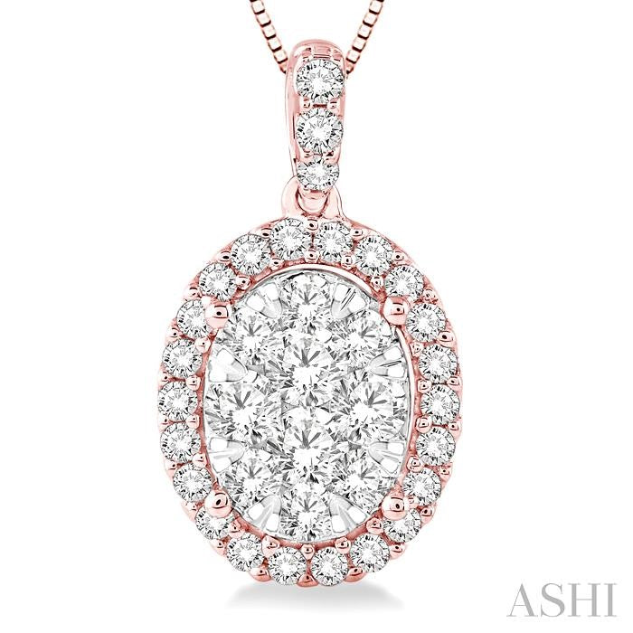 Expertly crafted in 14 karat rose and white gold, this beautiful lovebright pendant features a set of 10 invisible set round cut diamonds in oval shape bordered with a frame of dazzling 26 prong set round cut diamonds along with the front edge. A perfect gift to celebrate a special occasion. This pendant comes with an elegant box chain. Total diamond weight is 1 ctw. Other metal types & colors may be available.