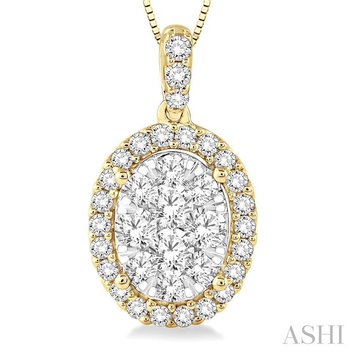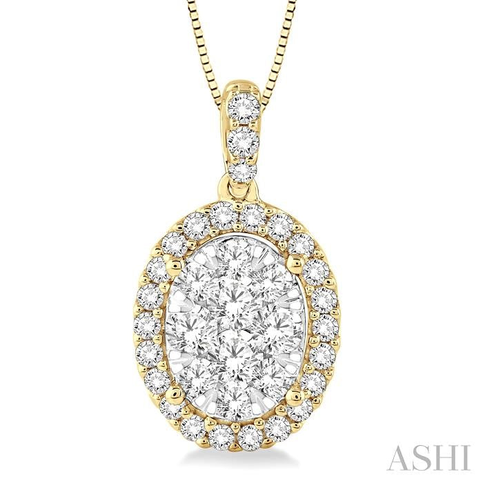 Expertly crafted in 14 karat yellow and white gold, this beautiful lovebright pendant features an array of 10 invisible set round cut diamonds in oval shape bordered with a frame of dazzling 26 prong set round cut diamonds along with the front edge. A perfect gift to celebrate a special occasion. This pendant comes with a elegant box chain. Total diamond weight is 1 ctw. Other metal types & colors may be available.