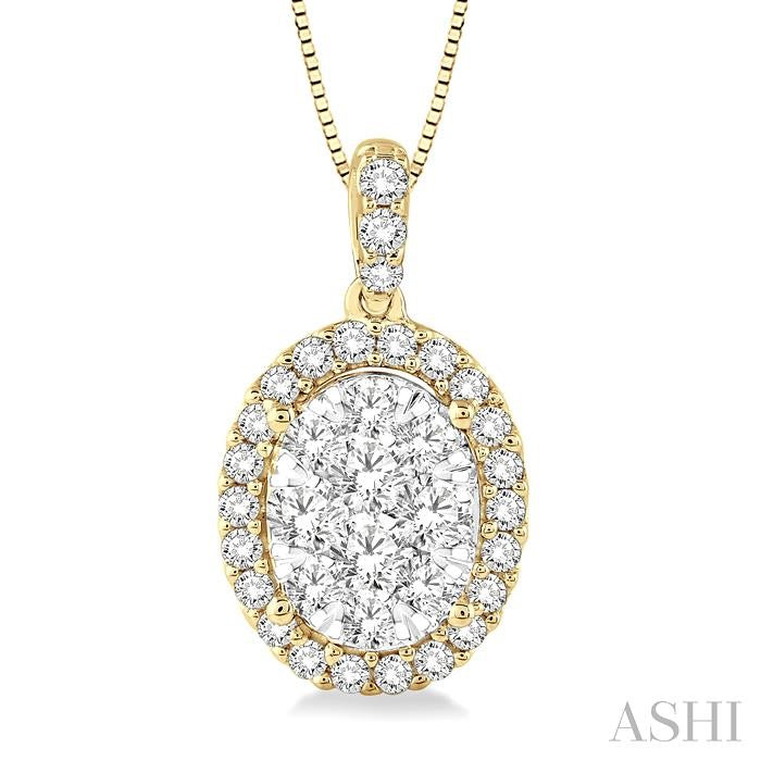 Expertly crafted in 14 karat yellow and white gold, this beautiful lovebright pendant features an array of 10 invisible set round cut diamonds in oval shape bordered with a frame of dazzling 24 prong set round cut diamonds along with the front edge. A perfect gift to celebrate a special occasion. This pendant comes with a elegant box chain. Total diamond weight is 3/4 ctw. Other metal types & colors may be available.