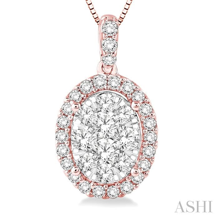 Expertly crafted in 14 karat rose and white gold, this beautiful lovebright pendant features a set of 10 invisible set round cut diamonds in oval shape bordered with a frame of dazzling 26 prong set round cut diamonds along with the front edge. A perfect gift to celebrate a special occasion. This pendant comes with an elegant box chain. Total diamond weight is 1/2 ctw. Other metal types & colors may be available.