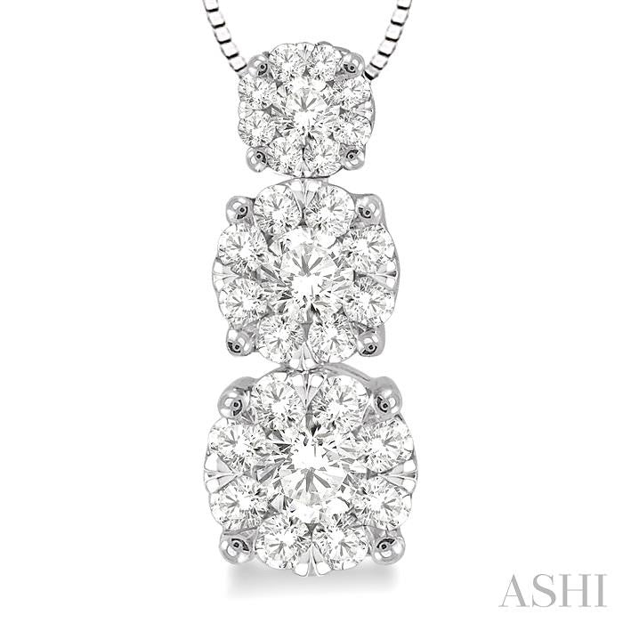 Show her your love with this elegant diamond lovebright pendant. Rendered perfectly in 14 karat white gold, this pendant showcases three round frames embellished with array of dazzling round cut accented diamonds. Brilliant 27 round cut diamonds are finely set in invisible settings. This pendant hangs with a fashionable box chain. Total diamond weight is 1/3 ctw. Other metal types & colors may be available.