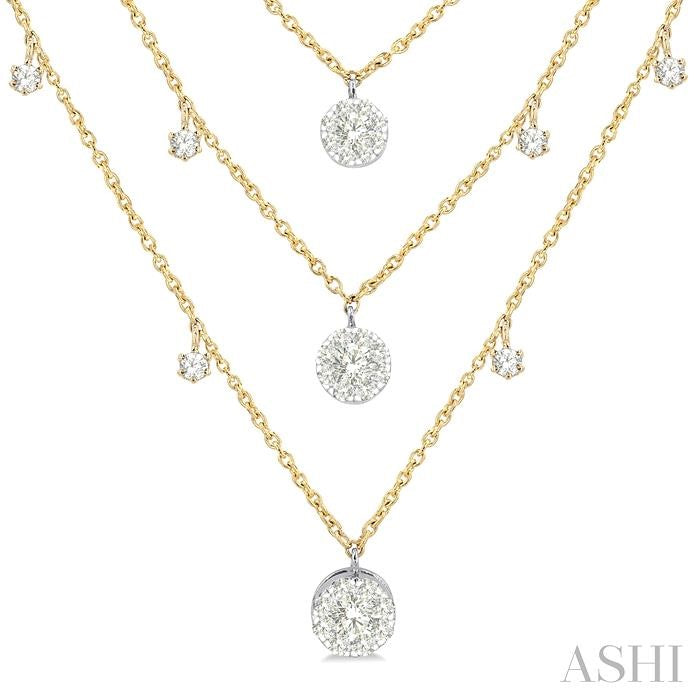 An attractive and showy diamond layered necklace, this stands true to the impeccable style of the Lovebright Collection, from where it hails. The classy necklace features a 3-layered design, with each layer adorned by a circular mount centerpiece, showcasing a 14 karat white gold mount within it. Each of these white gold mounts dazzles with 9 invisible set round cut diamonds, 1 in the center, encircled by 8 diamonds, a total of 27 diamonds across the three mounts. Additionally, the lower two layers of the necklace display 2 each prong set round cut diamonds flanking the circular mounts, placed at intervals from each other, while the top layer has a single flanking diamond, total 10 diamonds in all. A Cat-25 chain completes the Lovebright layered necklace, which is styled in a two-tone polished rhodium finish 14 karat yellow and white gold. Total diamond weight is 1/2 ctw. Other metal types & colors may be available.