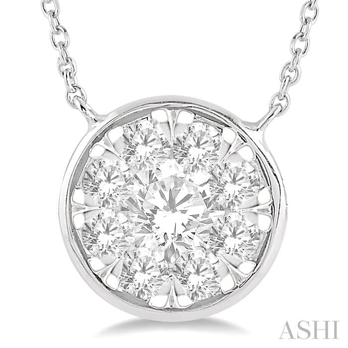 Enchant yourself with the elegance of this brilliant lovebright diamond pendant. Fashioned in luminous 14 karat white gold this gorgeous diamond pendant features 14 round cut diamonds, perfectly invisible and pave set. This pendant hangs with a fashionable box chain. Total diamond weight is 1/2 ctw. Other metal types & colors may be available.