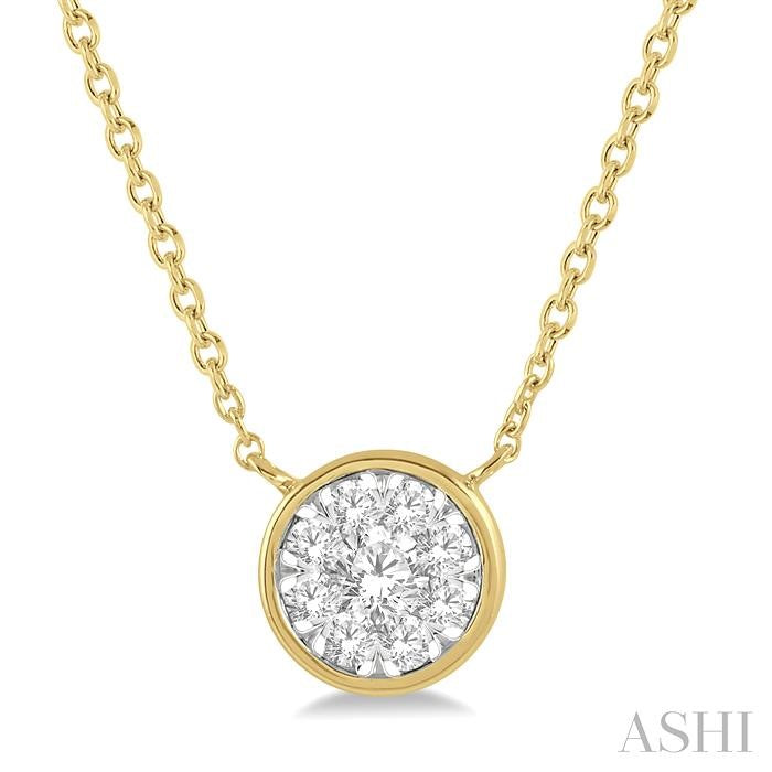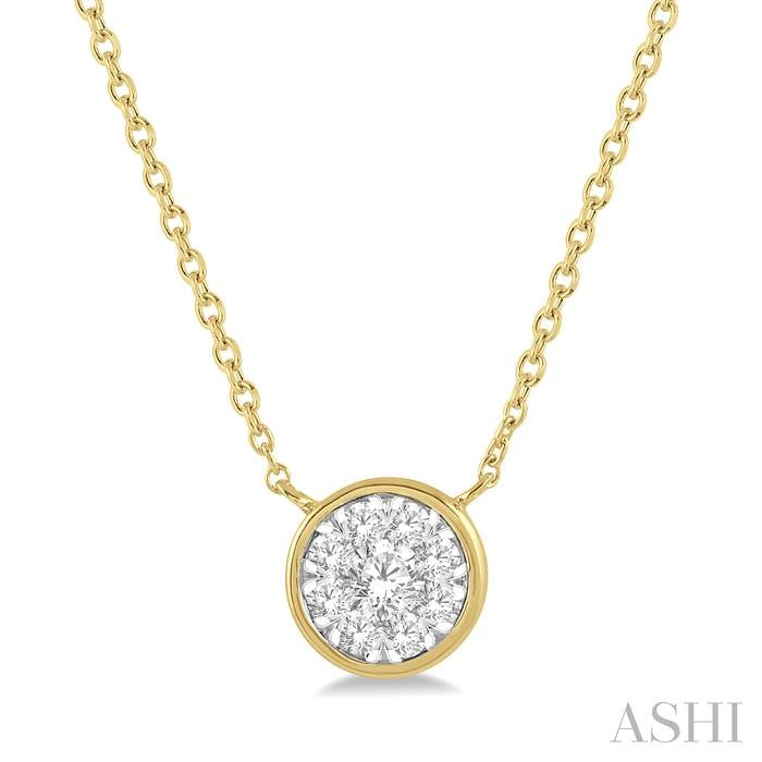 A gleaming Lovebright diamond necklace, this makes a pretty accessory for everyday or evening wear. It features a lustrous round necklace, studded with round-cut diamonds. A 1/20 ct invisible set round cut diamond embellishes the center, while 8 invisible sets of 1/50 ct round cut diamonds form a halo around this center stone. The necklace is held on an 18-inch cat chain that comes with a lobster clasp closure. Both necklace and link chain are molded in 14-karat yellow and white gold. The total diamond weight is 1/6 ctw. Other metal types & colors may be available.