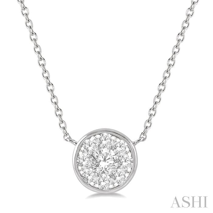 A gleaming Lovebright diamond necklace, this makes a pretty accessory for everyday or evening wear. It features a lustrous round necklace, studded with round-cut diamonds. A 1/6 ct invisible set round cut diamond embellishes the center, while 8 invisible sets of 1/50 ct round cut diamonds form a halo around this center stone. The necklace is held on an 18-inch cat chain that comes with a lobster clasp closure. Both necklace and link chain are molded in 14-karat white gold. The total diamond weight is 1/3 ctw. Other metal types & colors may be available.