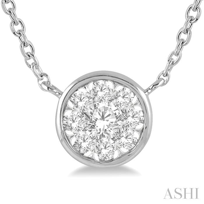 A gleaming Lovebright diamond necklace, this makes a pretty accessory for everyday or evening wear. It features a lustrous round necklace, studded with round-cut diamonds. A 1/10 ct invisible set round cut diamond embellishes the center, while 8 invisible sets of 1/50 ct round cut diamonds form a halo around this center stone. The necklace is held on an 18-inch CAT25 cat chain that comes with a lobster clasp closure. Both necklace and link chain are molded in 14-karat white gold. The total diamond weight is 1/4 ctw. Other metal types & colors may be available.