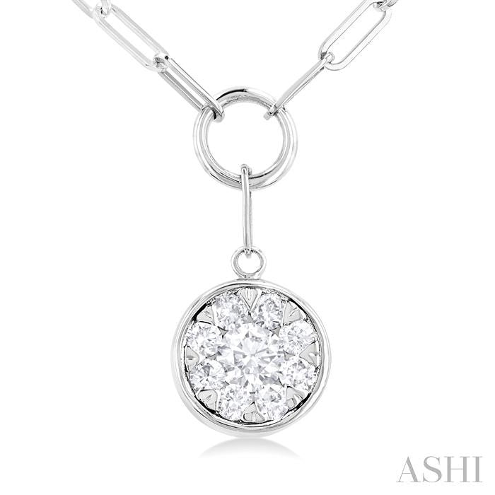 The Lovebright Collection is an assemblage that offers some of the finest pieces of jewelry that include from heavily adorned to minimal look jewelry. This diamond necklace is one of the simple ones. It features a small circular shape pendant, suspended from a round link at the center of the paper clip link chain that holds it. 9 invisible set round cut diamonds embellish the circular pendant, a 1/10 ctw invisible set round cut diamond in the center and 8 forming a halo around it. An 18-inch paper clip chain completes the Lovebright diamond necklace, which is designed in a polished rhodium finish 14 karat white gold. Total diamond weight is 1/4 ctw. Other metal types & colors may be available.