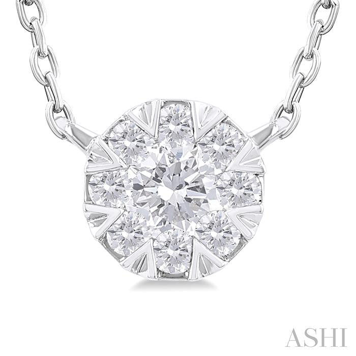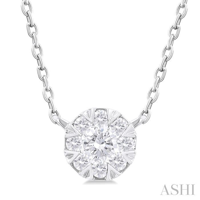Simple, but a smart addition to your jewelry collection, this Lovebright Petite diamond fashion pendant blends style with creative fun. The delicate pendant features a lovely round-shaped mount, embellished with a cluster of 9 invisible set round cut diamonds, 1 in the center and 8 haloing it, shimmering with every movement. The brilliant sparkle of these diamonds makes this pendant truly stand out. Paired with a CAT23 chain, the Lovebright diamond fashion pendant and chain are both styled in a rhodium finish 10 karat white gold. Total diamond weight is 1/10 ctw. Other metal types & colors may be available.