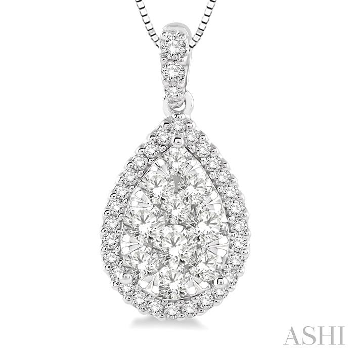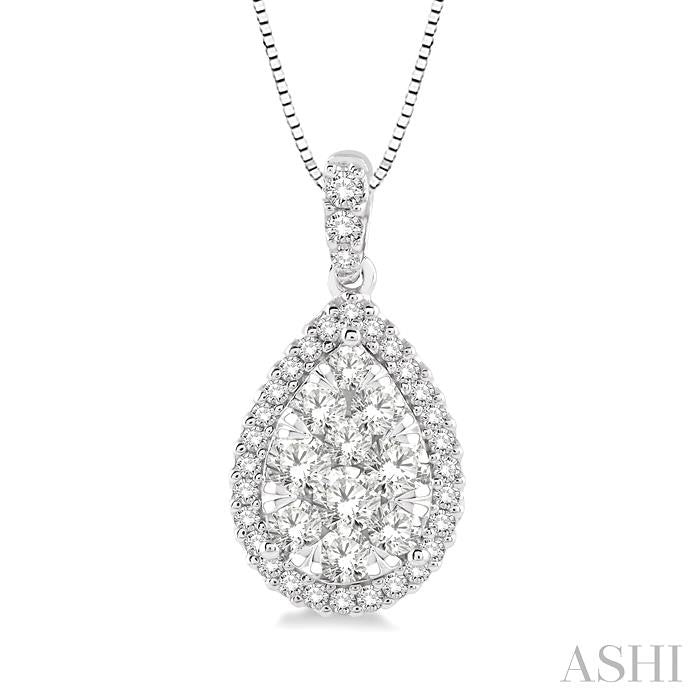 She will be elated at the look of this beautiful lovebright diamond pendant. Fashioned in 14 karat white gold, this pendant features a center array of sparkling round cut diamonds in pear shape design and embellished by a frame of smaller round accent diamonds surrounds the center arrays, completing this sparkling design. 42 diamonds are set in prong and invisible setting. This pendant hangs from a beautiful box chain. Total diamond weight is 1/2 ctw. Other metal types & colors may be available.