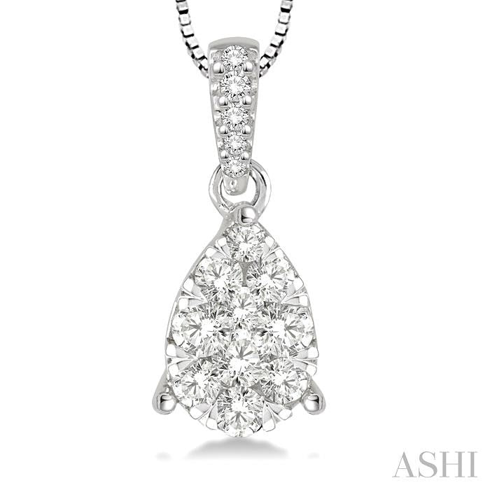 She will be elated at the look of this beautiful lovebright diamond pendant. Fashioned in 14 karat white gold, this pendant features a center array of sparkling round cut diamonds in pear shape design and embellished by a frame of smaller round accent diamonds surrounds the center arrays, completing this sparkling design. 41 diamonds are set in prong and invisible setting. This pendant hangs from a beautiful box chain. Total diamond weight is 1/3 ctw. Other metal types & colors may be available.