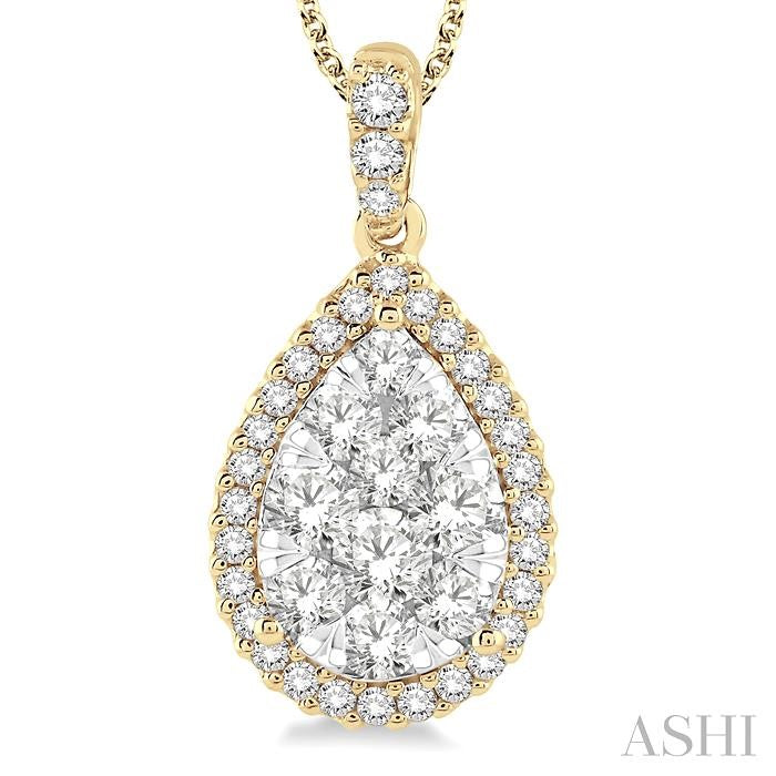 She will be elated at the look of this beautiful Lovebright diamond pendant. Fashioned in 14 karat yellow and white gold, this pendant features a center array of sparkling round cut diamonds in pear shape design and embellished by a frame of smaller round accent diamonds surrounds the center arrays, completing this sparkling design. 46 diamonds are set in prong and invisible setting. This pendant hangs from a beautiful box chain. Total diamond weight is 1 Ctw. Other metal types & colors may be available.