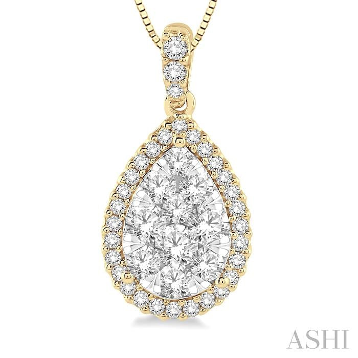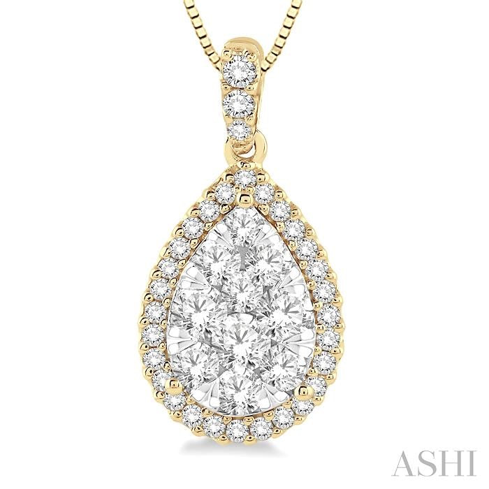 She will be elated at the look of this beautiful lovebright diamond pendant. Fashioned in 14 karat yellow and white gold, this pendant features a center array of sparkling round cut diamonds in pear shape design and embellished by a frame of smaller round accent diamonds surrounds the center arrays, completing this sparkling design. 42 diamonds are set in prong and invisible setting. This pendant hangs from a beautiful box chain. Total diamond weight is 1/2 ctw. Other metal types & colors may be available.