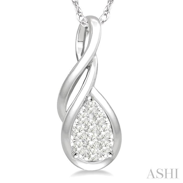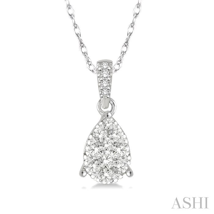 An attractive Lovebright Petite diamond fashion pendant, this is a fine piece to add to your smart casuals as well as your work formals. The charming pendant showcases a pear-shaped mount that captivates with its round cut diamond embellishments. The mount is beautifully decorated with a cluster of 10 invisible set round cut diamonds, each contributing to the pendant's brilliant sparkle. Accompanied by a CAT23 chain, both the diamond fashion pendant and chain are crafted in a rhodium finish 10 karat white gold. Total diamond weight is 1/10 ctw. Other metal types & colors may be available.