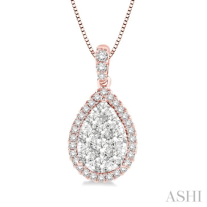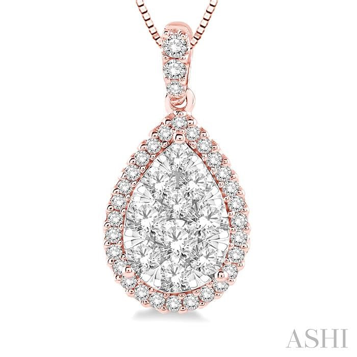 She will be elated at the look of this beautiful lovebright diamond pendant. Fashioned in 14 karat rose and white gold, this pendant features a center array of sparkling round cut diamonds in pear shape design and embellished by a frame of smaller round accent diamonds surrounds the center arrays, completing this sparkling design. 41 diamonds are set in prong and invisible setting. This pendant hangs from a beautiful box chain. Total diamond weight is 1/3 ctw. Other metal types & colors may be available.