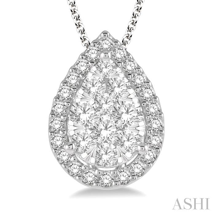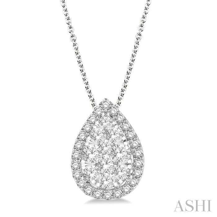 She will be elated at the look of this beautiful lovebright diamond pendant. Fashioned in 14 karat white gold, this pendant features a center array of sparkling round cut diamonds in pear shape design and embellished by a frame of smaller round accent diamonds surrounds the center arrays, completing this sparkling design. 46 diamonds are set in prong and invisible setting. This pendant hangs from a beautiful box chain. Total diamond weight is 3/4 ctw. Other metal types & colors may be available.