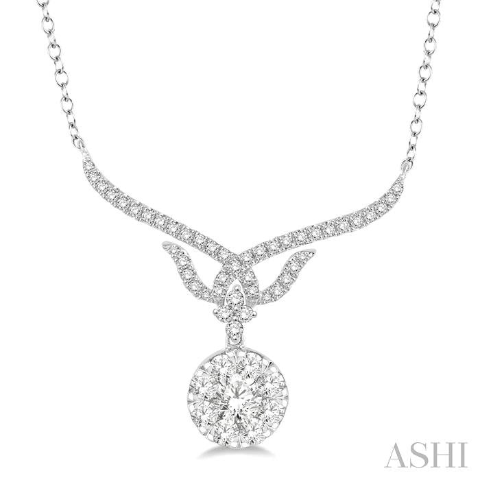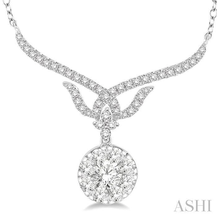 She will be captivated with this gorgeous diamond lovebright necklace, a token of your love. Rendered perfectly on luminous 14 karat white gold this design features a row of round cut diamond-lined that sweep and swirl into a graceful shape. A set of shimmering round cut accented diamonds in halo shape drop centers the necklace to complete the look. This necklace suspends from a beautiful cat chain. Dazzling 54 round cut diamonds are set in invisible, prong and pave settings. Total diamond weight is 1 1/10 ctw. Other metal types & colors may be available.