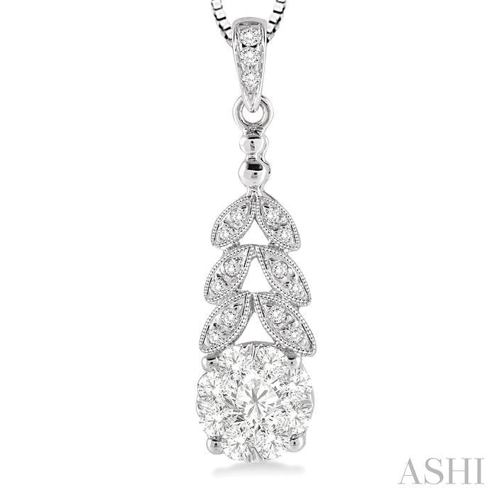 Proclaim your love proudly with this stylishly designed lovebright diamond pendant. Fashioned in glinting 14 karat white gold this infinity designed pendant is lined with 23 dazzling pave and invisible set round cut diamonds and an array of invisible set round diamonds in floral motif dangles at the bottom . This chic pendant dangles from a stunning box chain. Total diamond weight is 1/2 ctw. Other metal types & colors may be available.