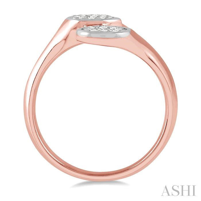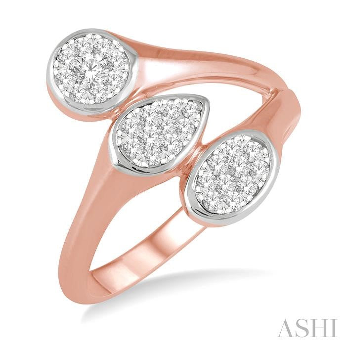 This Lovebright diamond fashion ring offers an exquisite blend of sophistication, style, and beauty. It showcases a unique tri-mount centerpiece, featuring mixed shape mounts that add a modern and eye-catching twist to the design. The centerpiece comprises a pear-shaped mount on one end of the shank, embraced by a round and oval-shaped mount that lie at the split end of the shank on the other side. Each mount is meticulously set with round cut diamonds, sparkling effortlessly and creating a breathtaking contrast against the rose gold body and the lustrous shine of the white gold mount. There are a total of 29 invisible set round cut diamonds embellishing the mounts. The Lovebright fashion ring is crafted in a polished rhodium finish 10 karat rose and white gold. Total diamond weight is 1/3 ctw. Other metal types & colors may be available.
