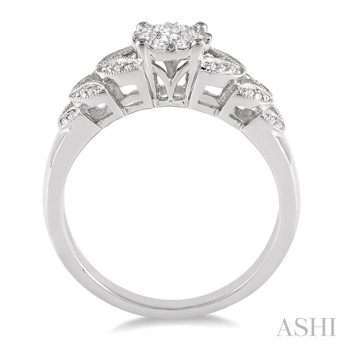 Surprise your sweetheart with this blooming lovebright diamond ring filled with love. Fashioned in 10 karat gleaming white gold, the center of this ring features an array of 9 invisible set round cut diamonds and the milgrain finished shank is adorn with 28 radiant pave set round cut side stones diamonds in petal shape. Total diamond weight is 1/3 ctw. Other metal types & colors may be available.