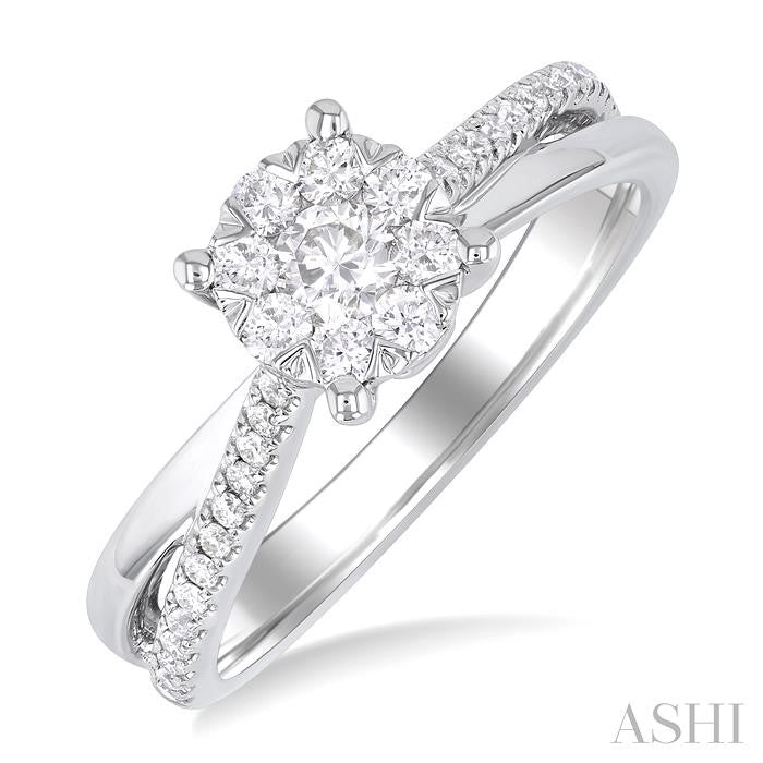 Reflecting the depth of your commitment and the brilliance of your love story, this Lovebright diamond engagement ring, marks the beginning of your forever together journey of an enduring love and unity. The ring features a raised circular mount, housed with 9 invisible set round cut diamonds, 1 in the center and 8 haloing it. A split shank, with plain gold and diamond adorned criss cross arms, completes the ring. 13 each, total 26, micro wall set round cut diamonds embellish the diamond arms on either side of the shan. Also, a bezel set round cut diamond each, total 2, is seen encrusted on the front and back of the head. The Lovebright engagement ring is crafted in a polished rhodium finish 14 karat white gold. Total diamond weight is 1/2 ctw. Other metal types & colors may be available.